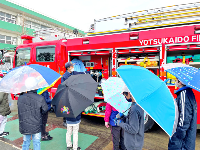 今回、先に消防車を見学してからDVDを見るグループと、DVDを見てから見学する2グループに分かれ、その後、体育館で消防団の方に質問をする予定でしたが、なんと、後半のグループが見学をする少し前に出動要請があり、後半グループは消防車の周りを1周した後、消防車が出動するのを見送って終わってしまいました…