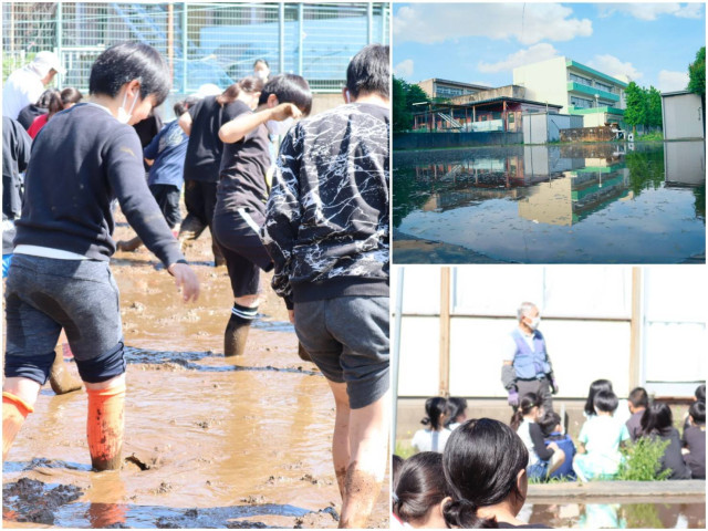 汚れても良い服装、靴下で泥の感触や土の匂い、水の冷たさなど自然を感じながら子供たちは楽しそうに作業します