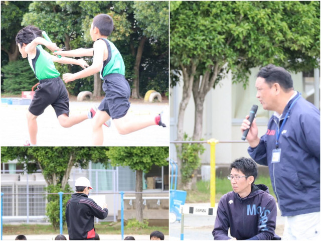 校庭で全校児童が並ぶ前で陸上部のメンバーによる種目練習が公開されました