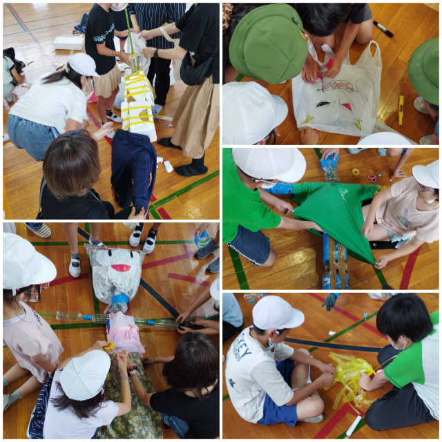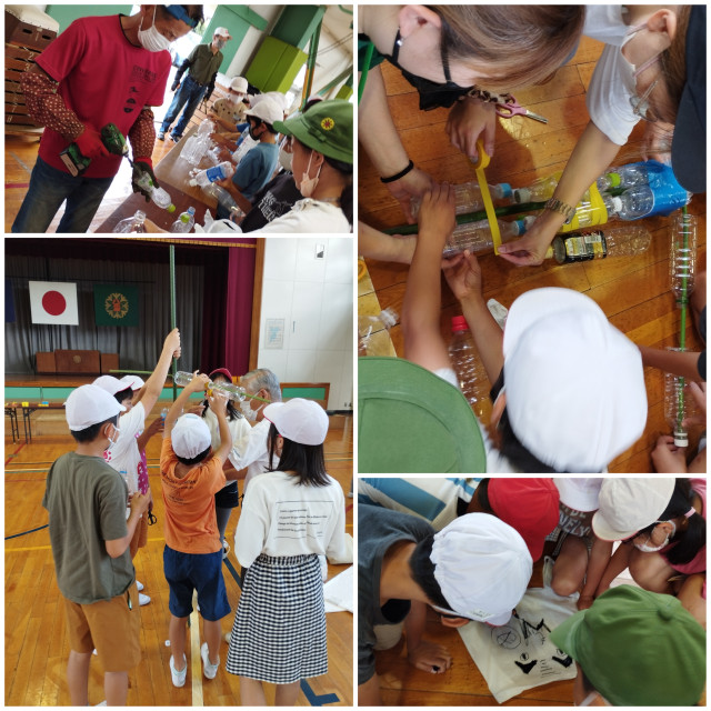 支柱を支える子、ペットボトルを通す子、布テープで巻く子、協力し合いながら楽しく作業していきます