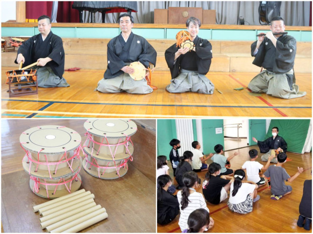 一般社団法人阪神能楽囃子連盟調和会の皆さんにお越しいただき、日本を代表する舞台芸術である能楽につて教えていただきました
