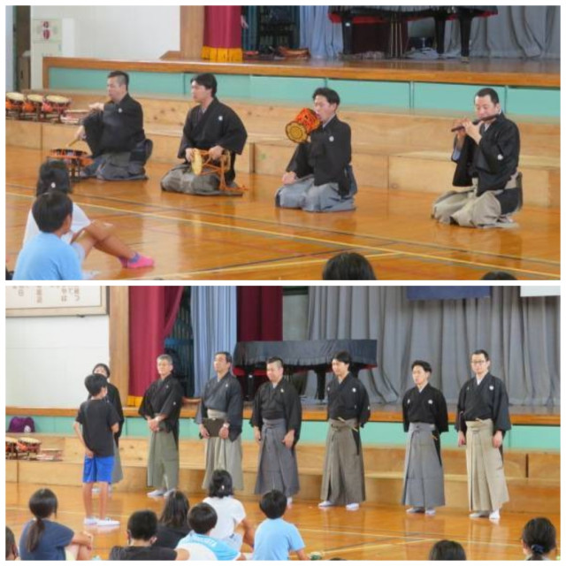 文化芸術鑑賞教室は、文化庁による、我が国の一流の文化芸術団体による公演を鑑賞することで、子供たちの発想力、コミュニケーション能力の育成をはかり、将来の芸術家の育成や芸術鑑賞能力の向上に繫げるための事業の一環で、今回は阪神能楽囃子連盟「調和会」の皆様をお招きし開催されました
