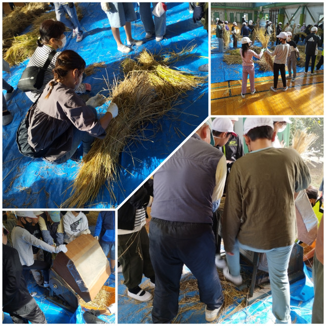 脱穀した藁は、保護者の方々が8束ずつ麻紐でまとめていきます