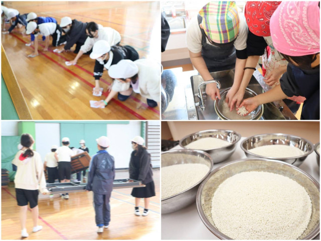 前日に子供たちとPTAのお手伝いの皆さんで、お米を研ぎ水に浸したり、会場設営準備や用具の確認等を行いました
