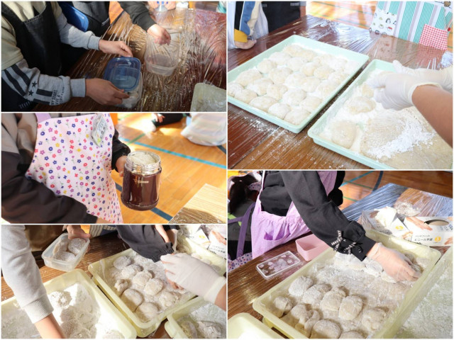 当日も朝早くからボランティアの皆さんやPTAのお手伝いの皆さんが、臼と杵を熱湯で拭いたり、つき上がったお餅を丸めるトレーや餅とり粉を準備したり、家庭科室で一晩水に浸けたもち米を蒸したりと準備を進めてくださいました