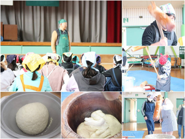 少し粒が残る程度に餅つき機で潰した状態のもち米が体育館に運ばれてくると、1組と2組に分かれいよいよ餅つきが始まりました