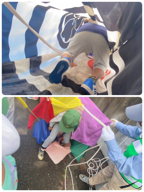 見学中には鯉のぼりを上げているボランティアさんの協力で、9メートルもある鯉のぼりの中をくぐるという貴重な経験をさせてもらいました。