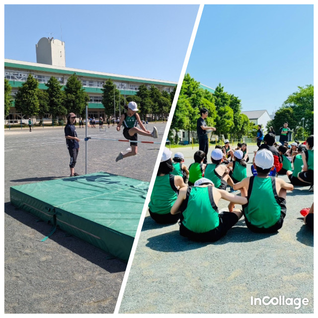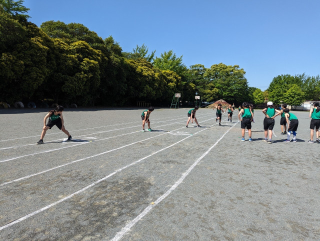 校庭で全校児童が並ぶ前で陸上部のメンバーによる種目練習が公開されました