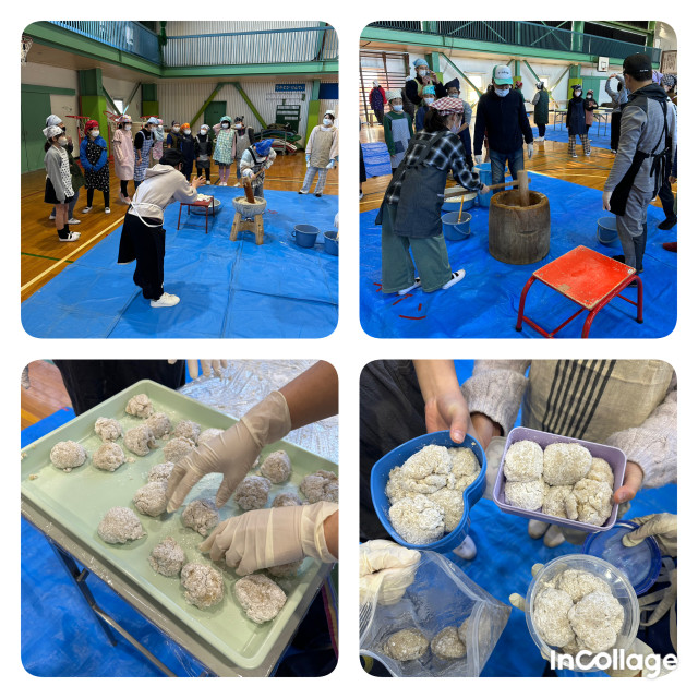 少し粒が残る程度に餅つき機で潰した状態にして体育館に持って行きます