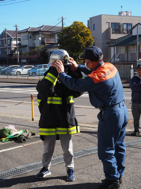 防火服の着用体験では、実際に消防士の方が利用している上着とヘルメットを着用させてもらいました。