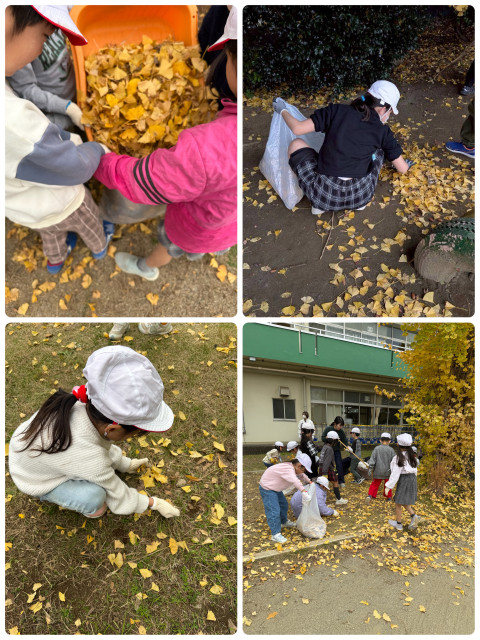 先生と生徒で協力して校庭の落ち葉や枝を拾い