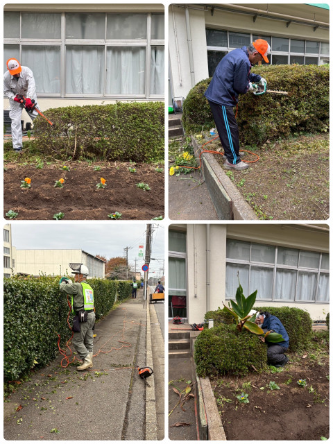 環境美化活動として外周の垣根や低木の剪定、除草などをボランティアさんとPTAで行いました。