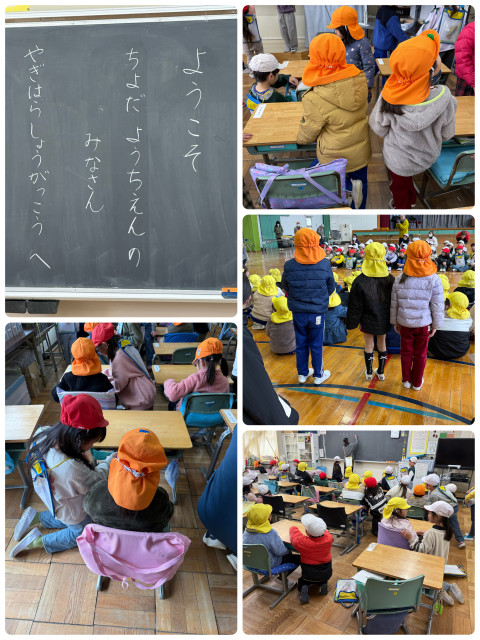 初めての教室に幼稚園児達は嬉しそうでした。1年生は掲示物や持ち物を色々見せてあげたり説明してあげたりしていました。