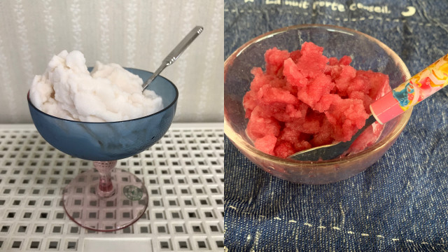 かなり冷たくなるのでタオルを巻いて、お子様がご一緒のおうちは交代しながら3〜4分ほどもみもみすると、だんだんと凍り始めてシャーベット状になってきます😊