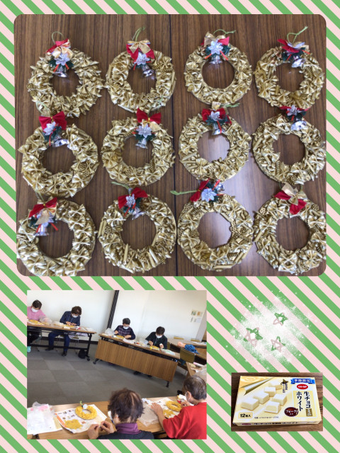 まずは数種類のマカロニをリース型のダンボールに貼っていく作業から…