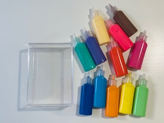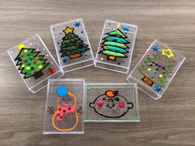 100均で売っているクリアケースに、ガラス用の絵の具で絵のふちをとり、その中を色々な色で模様付け。