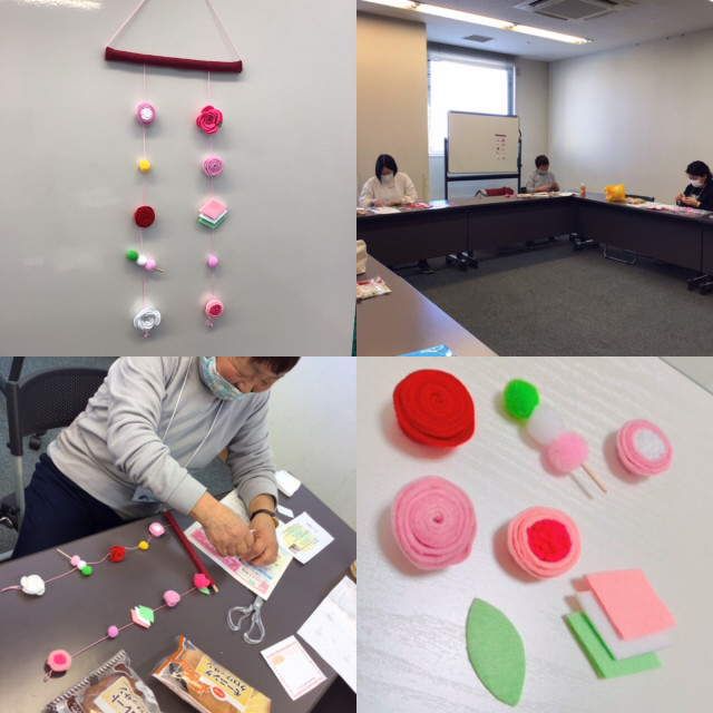 とても細かい作業が多かったので、所々苦戦しながらも、桃などのお花数種類・三色団子やひしもちなど、小さくて可愛い飾りができました。