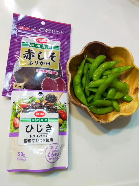炊いたご飯にひじきとCO・OPの赤しそふりかけ、