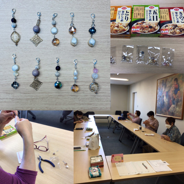 100均のビーズやパーツをあらかじめ組み合わせてセットしておいたキットを配り、皆さん好きな並びでビーズを並べて作成しました。