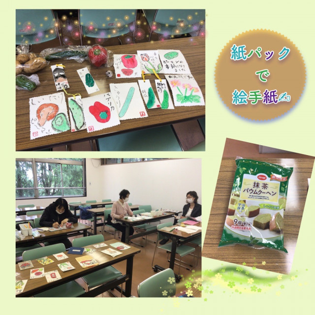 メンバーさんおひとりをお迎えして、皆さんで紙パックを使って絵手紙作りをしました♪