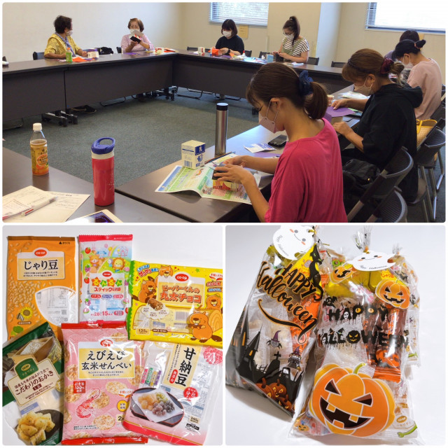 『trick or treat』と言ってコープ商品の詰め合わせの試食品を中に入れて配りました!