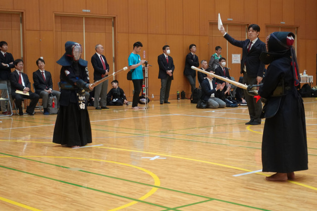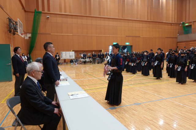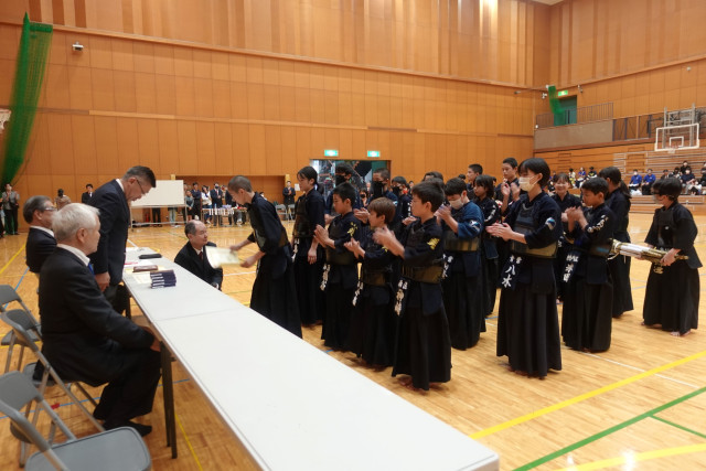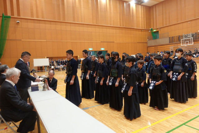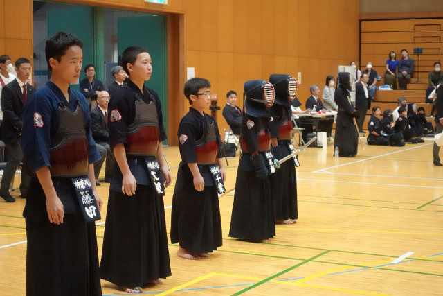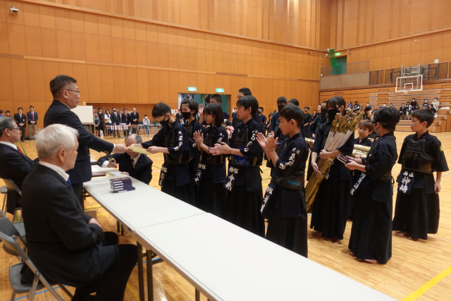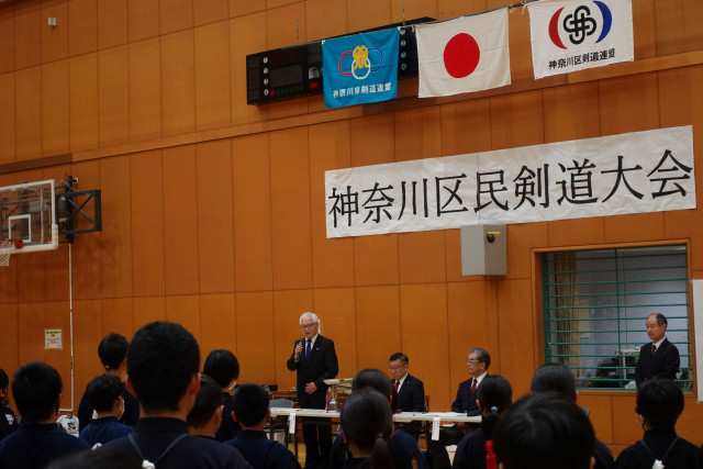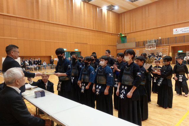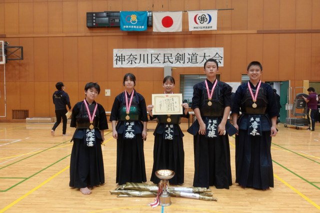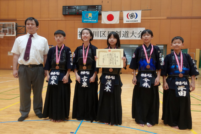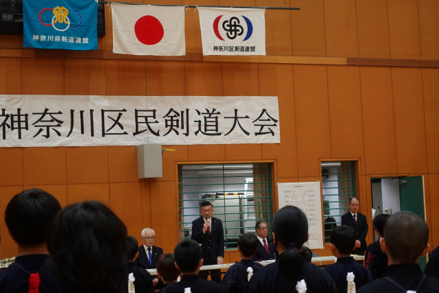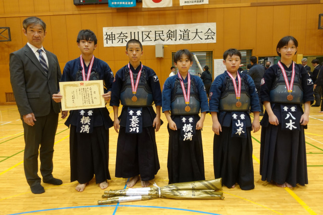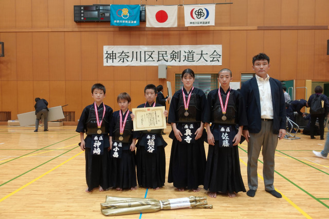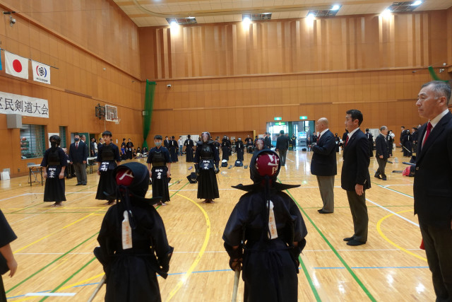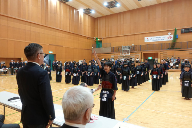 神奈川区民剣道大会の午後の部は、横浜市内の14チームを招待して、小学生3名、中学生2名の5人制団体戦が行われました。