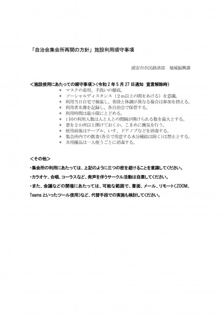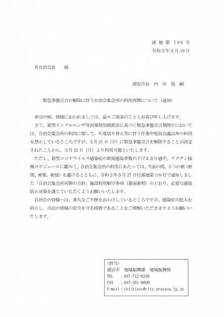緊急事態宣言の解除により、3/22より自治会集会所の利用が再開されます。