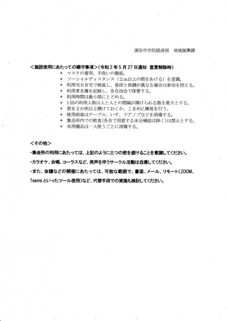新型インフルエンザ等対策特別措置法に基づく、まん延防止等重点措置の浦安市への適用が延長されたことから、自治会集会所の利用時間についての措置も延長になりました。