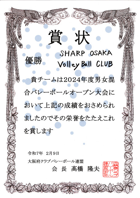 2025年2月9日、岸和田市中央体育館で開催された「2024年度大阪府クラブバレーボール連盟男女混合オープン大会」で、SHARP OSAKA Volley Ball CLUBが見事優勝を果たしました。