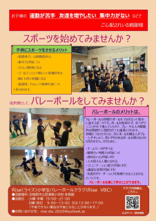 バレーボールを通じて、お子様の運動不足の解消や、運動の苦手な子の体力づくりに、いかがでしょうか。
