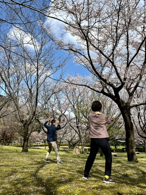 この公園、ソメイヨシノだけではなくさまざまな種類の桜の木が植っていて、いろいろな桜色が新緑の優しい緑色と一緒に目に飛び込んできます。「ああ、気持ちいい。」生徒さんがランジャーイを練習しながら発した一言。心が気持ちいい状態で太極拳の練習ができること、体にとっても良いことばかり。