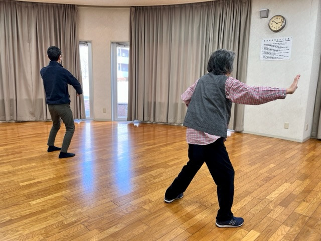 今日は、座っても練習できる太極拳です。今日で5回目のMさん、重心移動を意識して座ってランジャーイー。しばらくして、立ってランジャーイー。この繰り返しをしました。