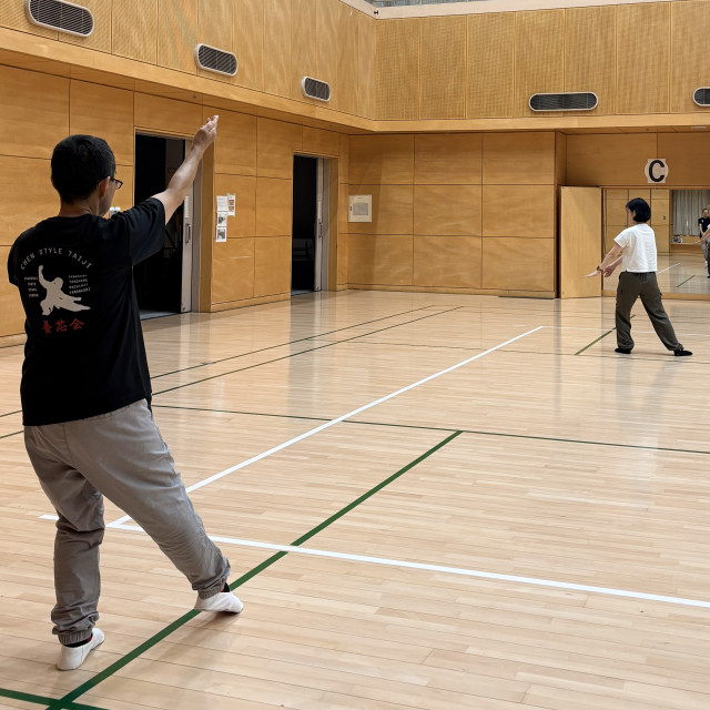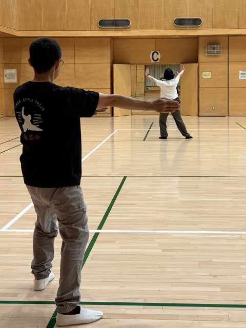 普段、鏡を見ながらの練習はせず、視覚に頼らず頭で考え自分の感覚で身体の立体やバランスの調整をしています。そして今日は、珍しく鏡があるので、五つの動作を生徒さんと並んで動き、腕の位置や身体の向き、肘が窄まってしまう動きなどを鏡を見ながら確認できました。細かいことを言い出すとキリがないので、大きな動きの間違えがないかをしっかり確認できました。