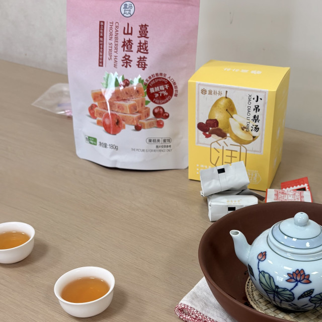 ↑上海のスーパーで買ってきた山楂のお菓子と梨茶