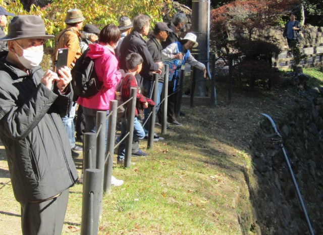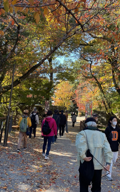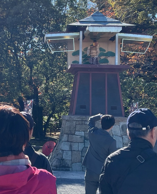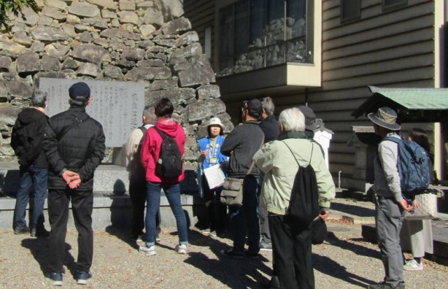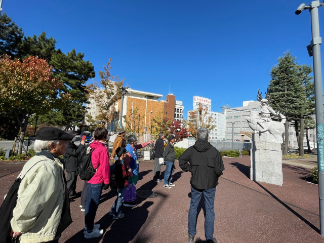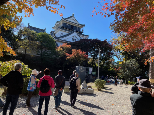 天下人 徳川家康の生誕地、岡崎のまち歩きを敢行しました。家康公の騎馬像前へ集合時刻前に行くも、既に観光ガイドの本多さんが待っておられた。この方、四天王の本多忠勝の末裔と聞いて驚く。皆さんが揃い、ガイドさんから説明を受けて20分程遅れて出発。四天王像の前で4人の特徴の説明を受ける。籠田公園を過ぎ、康生通りも説明を聞きつつ、ゆっくりと歩く。1時間弱かけ、岡崎公園へ。女性ガイドさんと交代し、11時のからくり時計(家康公の舞)を見てから公園内を散策。特徴のある石垣や岡崎城、謂れのある史跡の説明を受けた。時間が迫り、急いできっちん杉の子へ。各自、ビールとランチを食して解散。親睦と健康増進、そして知識を少しアップ出来ました。
