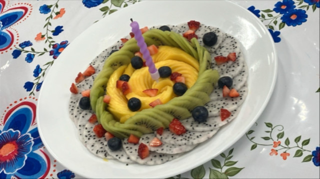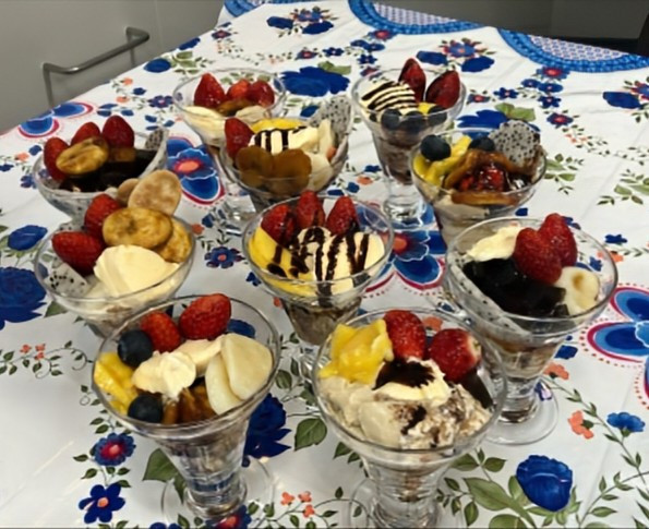 マンゴーやイチゴなどの果物とアイスクリームを載せた美味しいパフェを堪能しました🤤