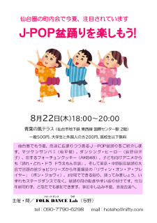 毎月2回、各国のやさしい踊りに親しむフォークダンス・ラボ。今回は仙台圏でも今夏、急速に広まりつつあるJ-POP盆踊りをご紹介します。マツケンサンバⅡ(松平健)、ダンシング・ヒーロ―(荻野目洋子)、恋するフォーチュンクッキー(AKB48)。子ども向けアニメからも「踊れ・どれ・ドラ ドラえもん音頭」。そして東京・中野駅前盆踊り大会で話題の盆ジョビシリーズから昨夏爆誕の「リヴィン・オン・ア・プレイヤー」(ボン・ジョヴィ)。2時間でできる限り、踊ってみましょう。いずれもステージダンスでなく、盆踊り用の動きやすい振り付けです。性別年齢問わず、どなたでも参加できます。事前申し込み不要。当日直接会場へ。