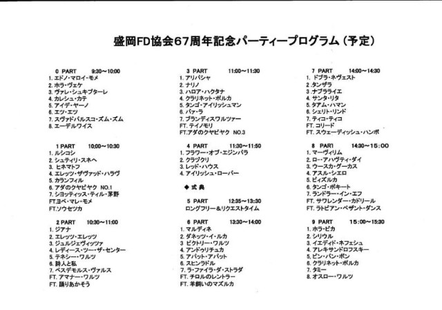 10月14日(月)に、盛岡フォークダンス協会の創立67周年パーティが盛岡市で開催されました。5年ぶりのパーティ開催との事。晴天に恵まれ、ゆったりとした体育館で参加者70名、のびのびと踊りました。機材、プロ、横断幕の到着が遅れたり、プロ変更あり、ハプニングありのパーティでしたが、和気藹々とした雰囲気で懐かしい曲を充分に楽しみました。(E•S)