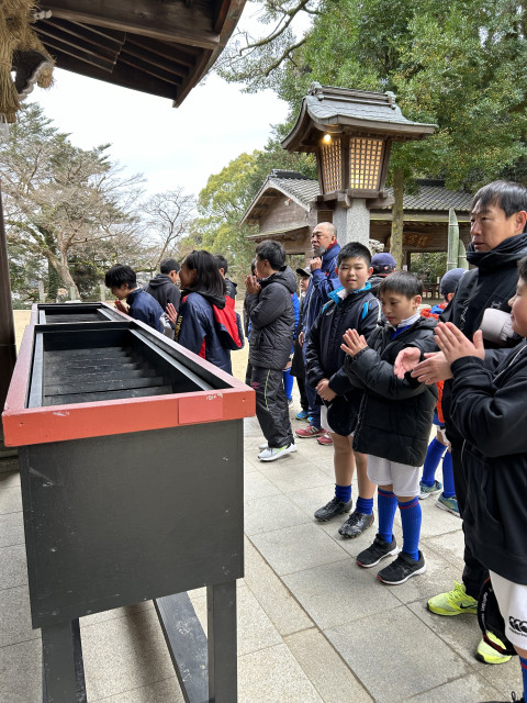 練習前に筑紫神社へ行き安全祈願を行なった後に2024年のコーチ体制を紹介しました。