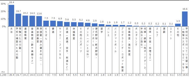 学研教育総合研究所によると、『習い事をしている子どもの割合は、全体で80.4%。ちょうど30年前の1989年度調査では、習い事をしている小学生は39.1%であったことから、平成元年から令和元年にかけて、「習い事」をする小学生は倍になったと言える』とのこと。