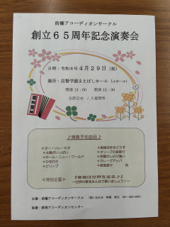 前橋アコーディオンサークル創立65周年記念演奏会の開催をお知らせします。 日時:令和8年4月29日(水・祝) 開場13:00 開演13:30 場所:昌賢学園まえばしホール 小ホール 特別企画:『音楽は世界を巡る♪』 〜世界の歌をみんなで歌いましょう!〜 全席自由、入場無料、申込不要です。 前橋は群馬県で最初に誕生したサークルです。ぜひご来場ください。
