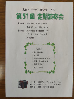 太田アコーディオンサークル第57回定期演奏会を開催します。 日時:令和8年3月22日(日) 開場12:30 開演13:00 場所:社会教育センタ 4階レクリエーション室 ※2/8更新