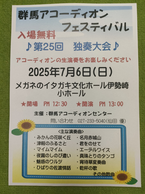 群馬アコーディオンセンターでは、令和7年7月6日(日)に、群馬アコーディオンフェスティバル第25回独奏大会を開催します。