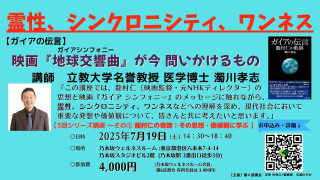 「この講座をでは、龍村仁〔映画監督・元NHKディレクター〕の思想と映画『ガイアシンフォニー』のメッセージに触れながら、霊性、シンクロニシティ、ワンネスなどへの理解を深め、現代社会において重要な発想や価値観について、皆さんと共に考えたいと思います。」