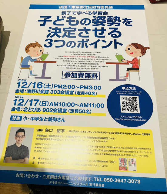 矢口さんは12/16(土)に親子で学べる子供の姿勢を決定させる3つのポイントについての無料セミナーも開催予定です。(詳細は写真参照)