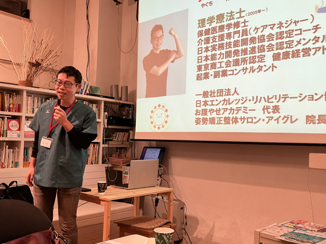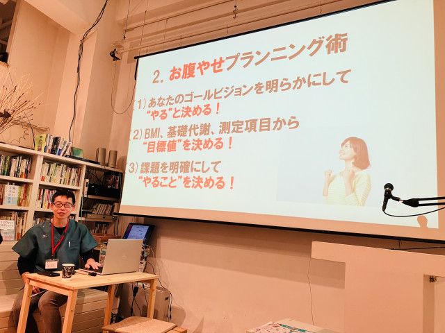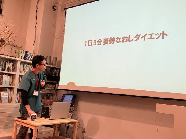 他己紹介で他の参加者さんとの交流や理解を深めた後、理学療法士であり、姿勢矯正整体、ダイエットトレーナーである矢口拓宇さんのセミナーが開催されました。