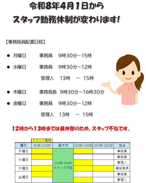 令和8年4月1日より、事務局スタッフの駐在日が次のように変わります!