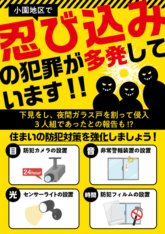 今年10月頃から小園地区で忍び込み(住人が就寝中に住宅へ侵入し、金品を盗む犯罪手口)の犯罪が多発しています!!
