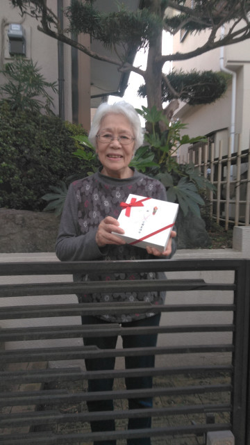 満面の笑みで、記念品を受け取っていただいた写真の女性は、6区在住の小川さんです。この日、たまたま地区社協のお楽しみ昼食会に参加して帰宅されたところで『久々に開催されて楽しかった食事会と大好きなお菓子をいただいて、とてもいい日だわ、嬉しいです。」と話されていました。