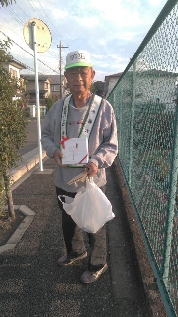 また、6区防犯パトロール隊長の溝口さんへお菓子をお渡ししたところ、「パトロール隊は、発足20周年を迎えました。発足当初から続けている方々もたくさんいますので、私ももう少し頑張ります。お菓子ありがとう。」と話されていました。